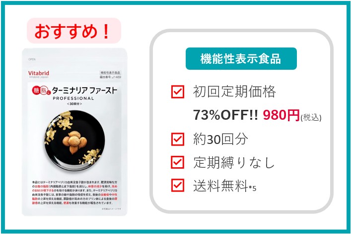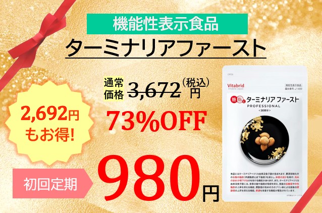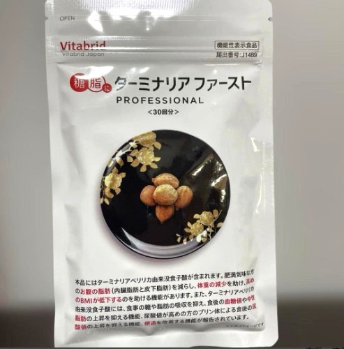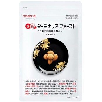 ターミナリアファースト プロフェッショナル5 機能性表示食品(届出番号 I1489) 機能性表示:本品にはターミナリアベリリカ由来没食子酸が含まれます。本品は、肥満気味な方のお腹の脂肪(内臓脂肪と皮下脂肪)を減らし、体重の減少を助け、高めのBMIが低下するのを助ける機能があります。ターミナリアベリリカ由来没食子酸には、食事の糖や脂肪の吸収を抑え、食後の血糖値や中性脂肪の上昇を抑える機能、尿酸値が高めの方の食事のプリン体による食後の尿酸値の上昇を抑える機能、便通を改善する機能が報告されています。 ※本品は、特定保健用食品と異なり、機能性及び安全性について国による評価を受けたものではありません。届け出られた科学的根拠等の情報は消費者庁のウェブサイトで確認できます。 ※本品は、医薬品ではなく、疾病の診断、治療、予防を目的としたものではありません。 ※食生活は、主食、主菜、副菜を基本に、食事のバランスを。