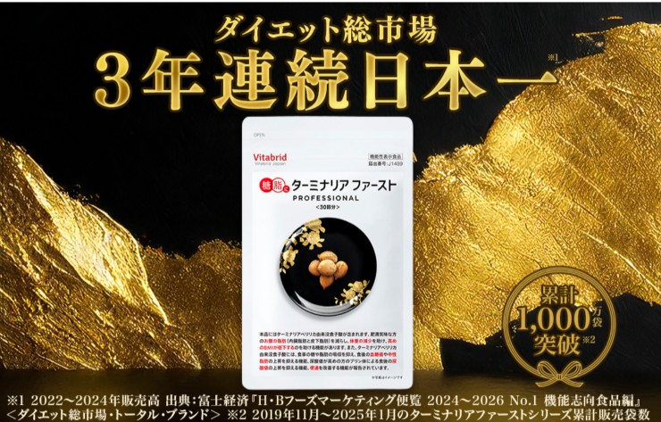 *1)2022~2024年販売高 出典:富士経済『H・Bフーズマーケティング便覧 2024~2026 No.1 機能志向食品編』<ダイエット総市場・トータル・ブランド> *2)2019年11月~2025年1月のターミナリアファーストシリーズ累計販売袋数 *4)楽天市場 ダイエット・健康>サプリメント>食物繊維/週間1位 2025年1月8日更新 (集計日:12月30日~1月5日) *5)ビタブリッドジャパン負担につき、初回送料無料
